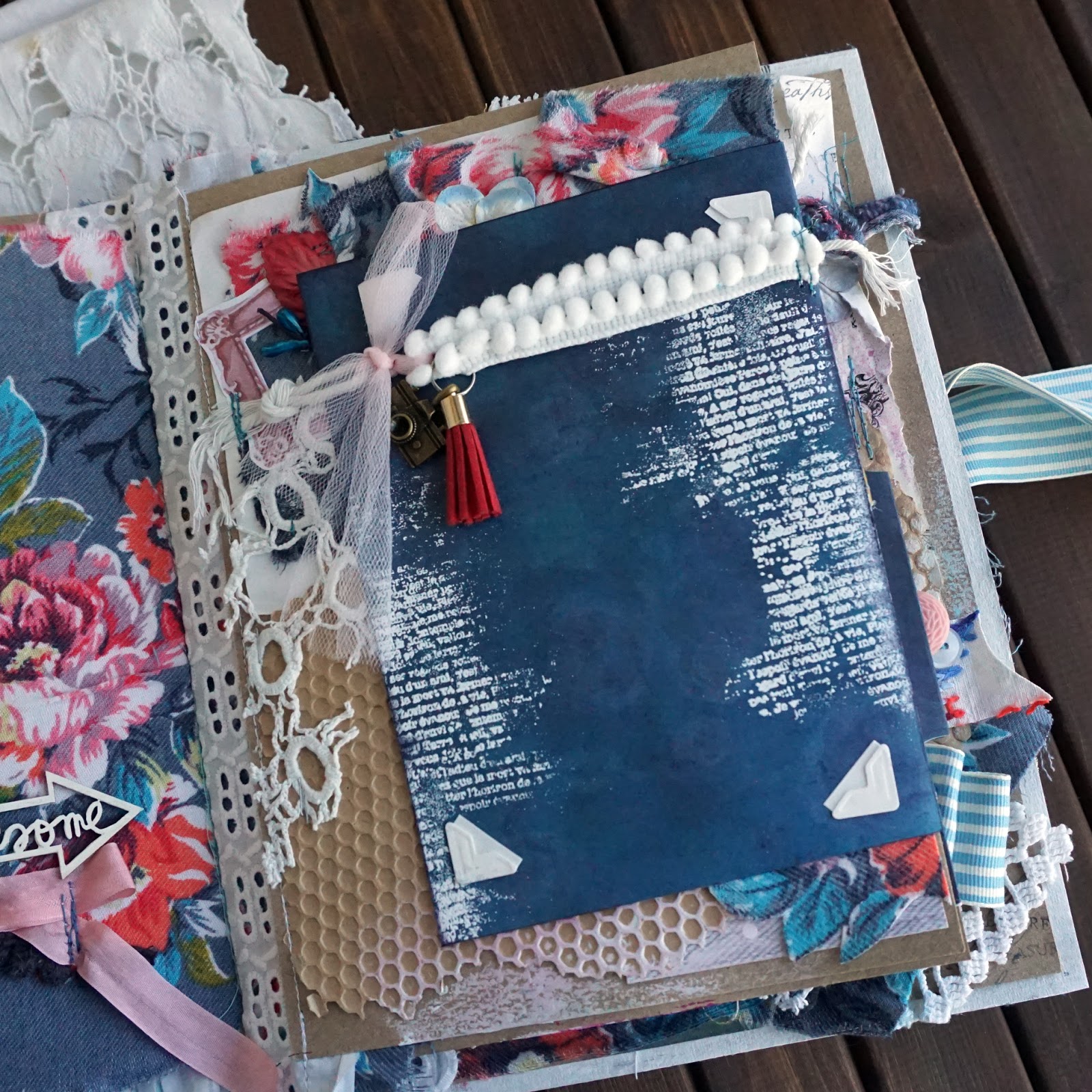 Альбом про дом, уют, любовь. Много разных тканечек, кружева, вышивки и всего того, что создает это ощущение уюта. Кармашки, конверты, секретики и даже обложка из пакета. Это ли не бохо?!